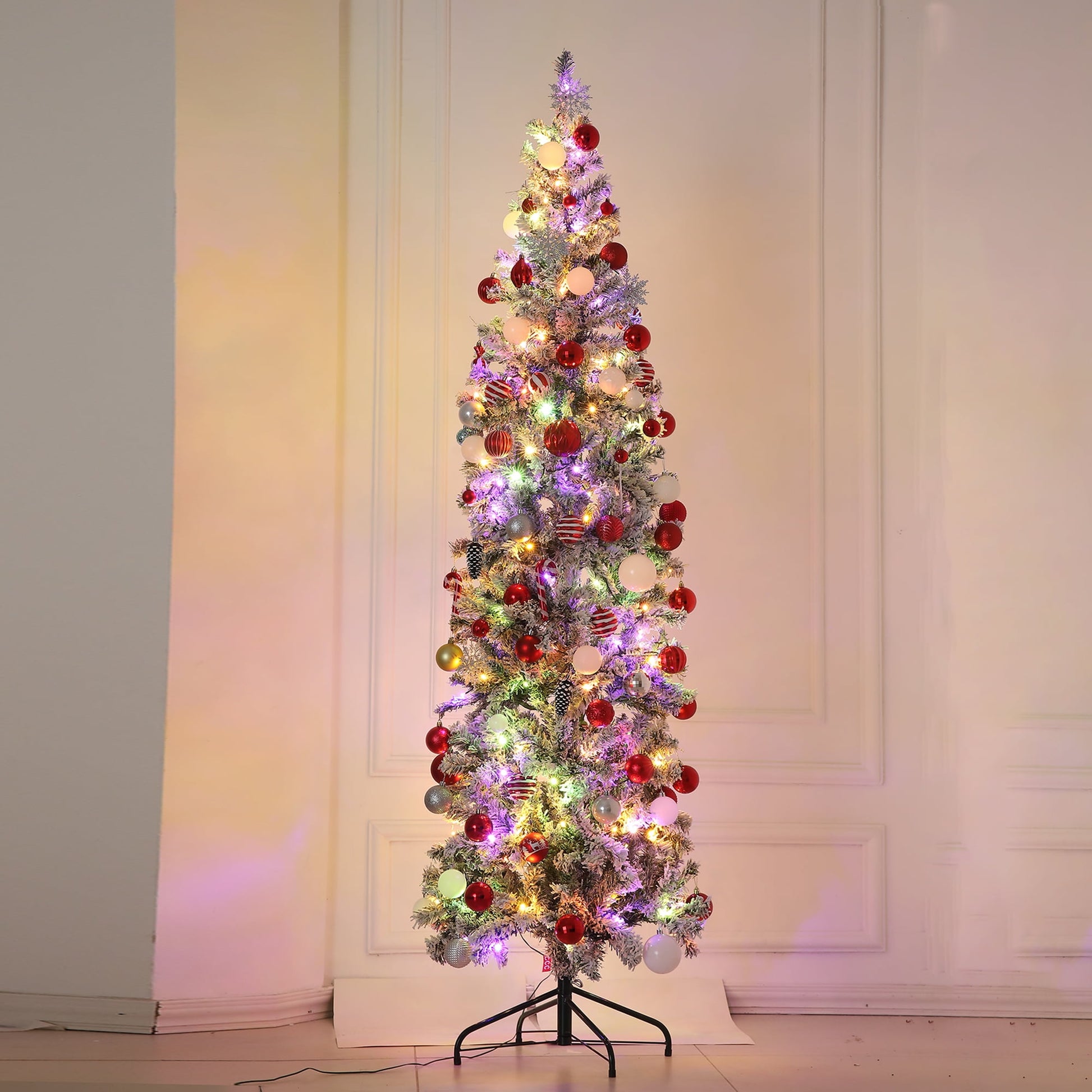 Goosiay 7ft Pre-Lit Artificial Snow Flocked Pencil Christmas Tree, Slim Holiday Xmas Tree with Warm White & Multicolor Lights, 10 Lighting Modes for Indoor Decoration